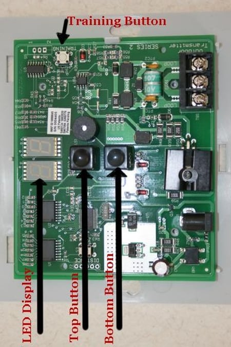 While holding the receiver (collar) near the transmitter, push and hold down the “training button” until the l.e.d. flashes "98". When it starts to flash remove your finger. It will continue to